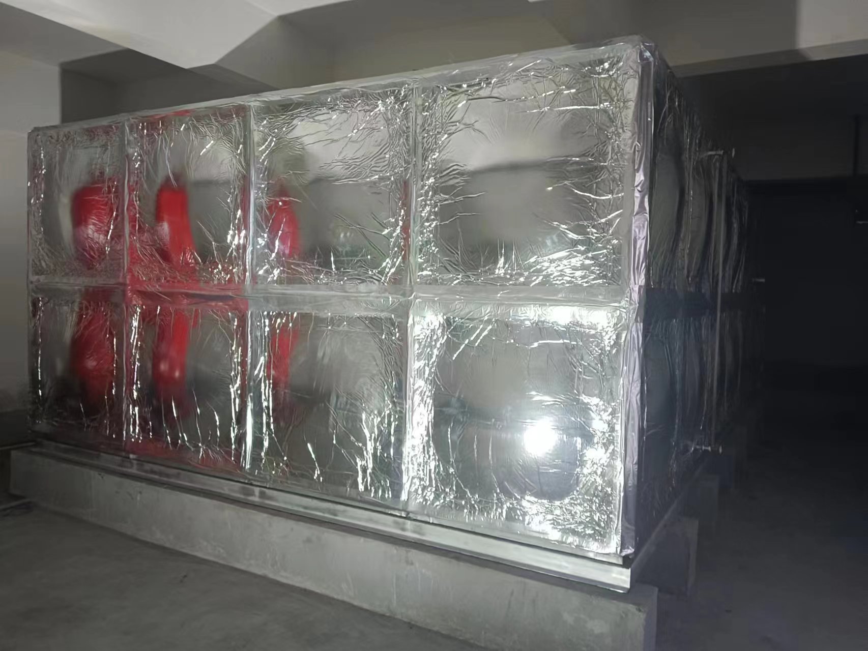 我廠承接的山東省濰坊市泰和東郡項目裝配式304不銹鋼保溫水箱已經(jīng)安裝試水完成。此水箱為螺絲組裝并加有橡塑鋁箔布保溫,此保溫的特點為在橡塑基體層表面粘合連接鋁箔層,經(jīng)過特殊處理使其成為一體,再加上鋁箔層本身的特征,大大加強了橡塑材料的各種性能指標。通過抗老化實驗,其使用年限可達30年以上,而起復合鋁箔層后可進一步降低材料的導熱系數(shù),增強其防結(jié)露性能,同時還能提高其抗壓強度幾十倍。此外由于鋁箔層為銀白色,增強了其外觀裝飾效果。該材料在使用中不會危害健康,能防止霉菌生長,避免害蟲或老鼠咬嚙,耐酸抗堿,是保溫材料中的理想絕熱材料。